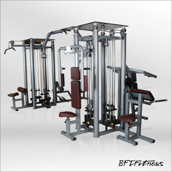 博菲特八站位綜合訓練器:高拉、推肩、低拉劃船、二頭肌、夾胸、大飛鳥龍門架、引體向上等功能,商用室內健身房器材生產廠家
